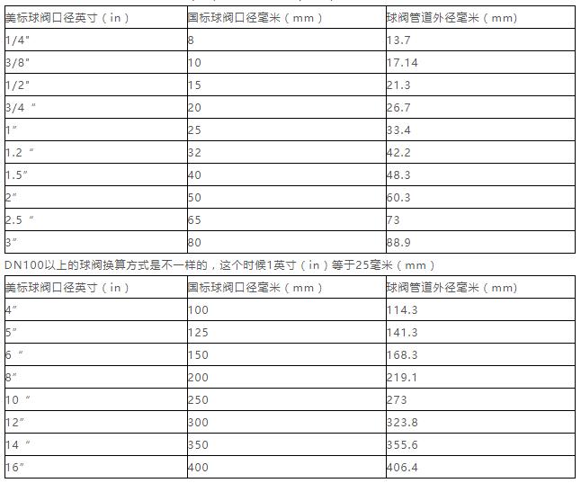 DN100以下的球閥規格換算成國標計量單位就是1英寸(in)等于25.4毫米(mm),如下: