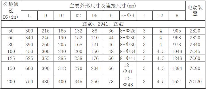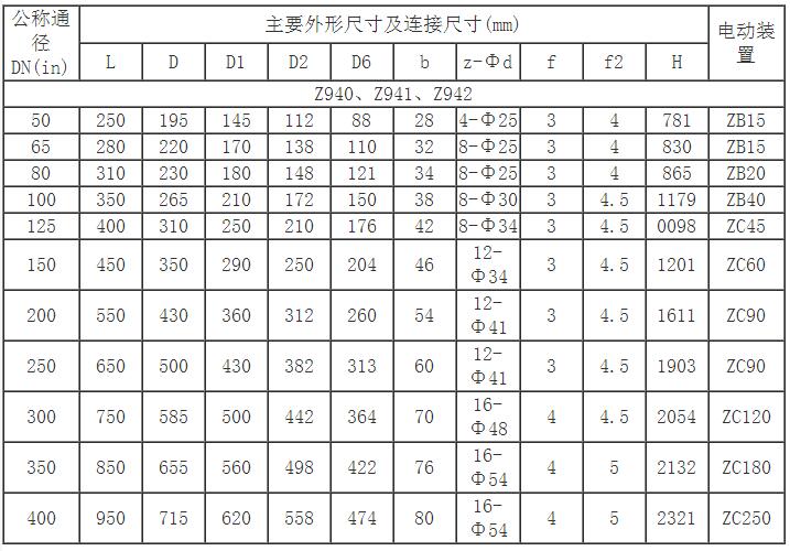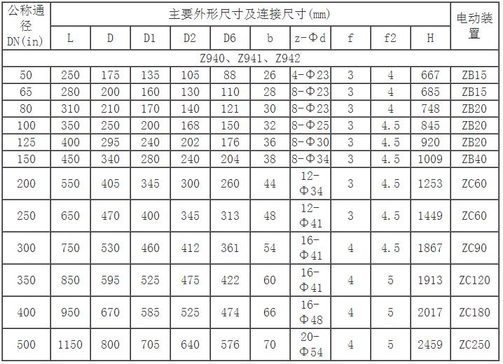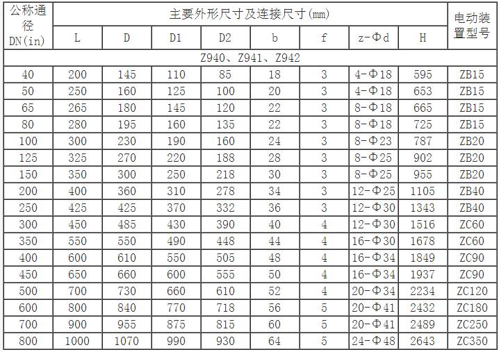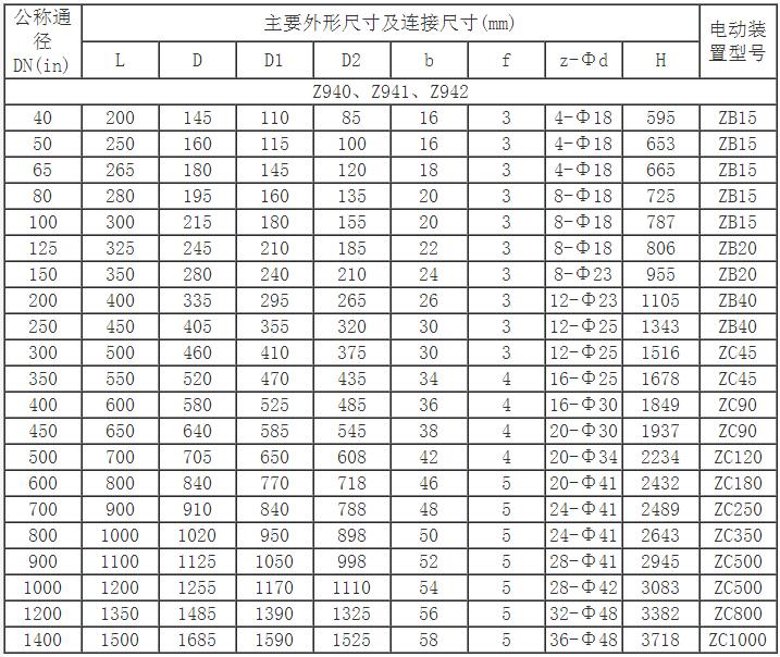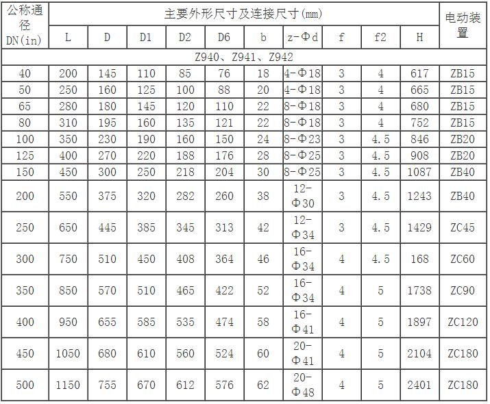 Z941H電動法蘭閘閥主要連接及外形尺寸(PN40)