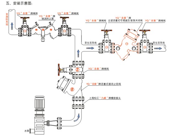 本閥用于生活與消防系統(tǒng)共用的供水系統(tǒng)中,當(dāng)消防系統(tǒng)開啟時(shí)壓力升高,本閥關(guān)閉、切斷生活用水,確保消防用水.